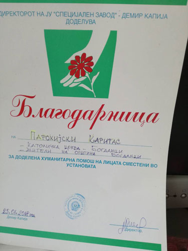 Парохискиот Каритас при парохијата „Свети Кирил и Методиј“ од Богданци на 25 јануари 2018 година ги предаде собраните алишта на ЈУ Специјалниот завод – Демир Капија.