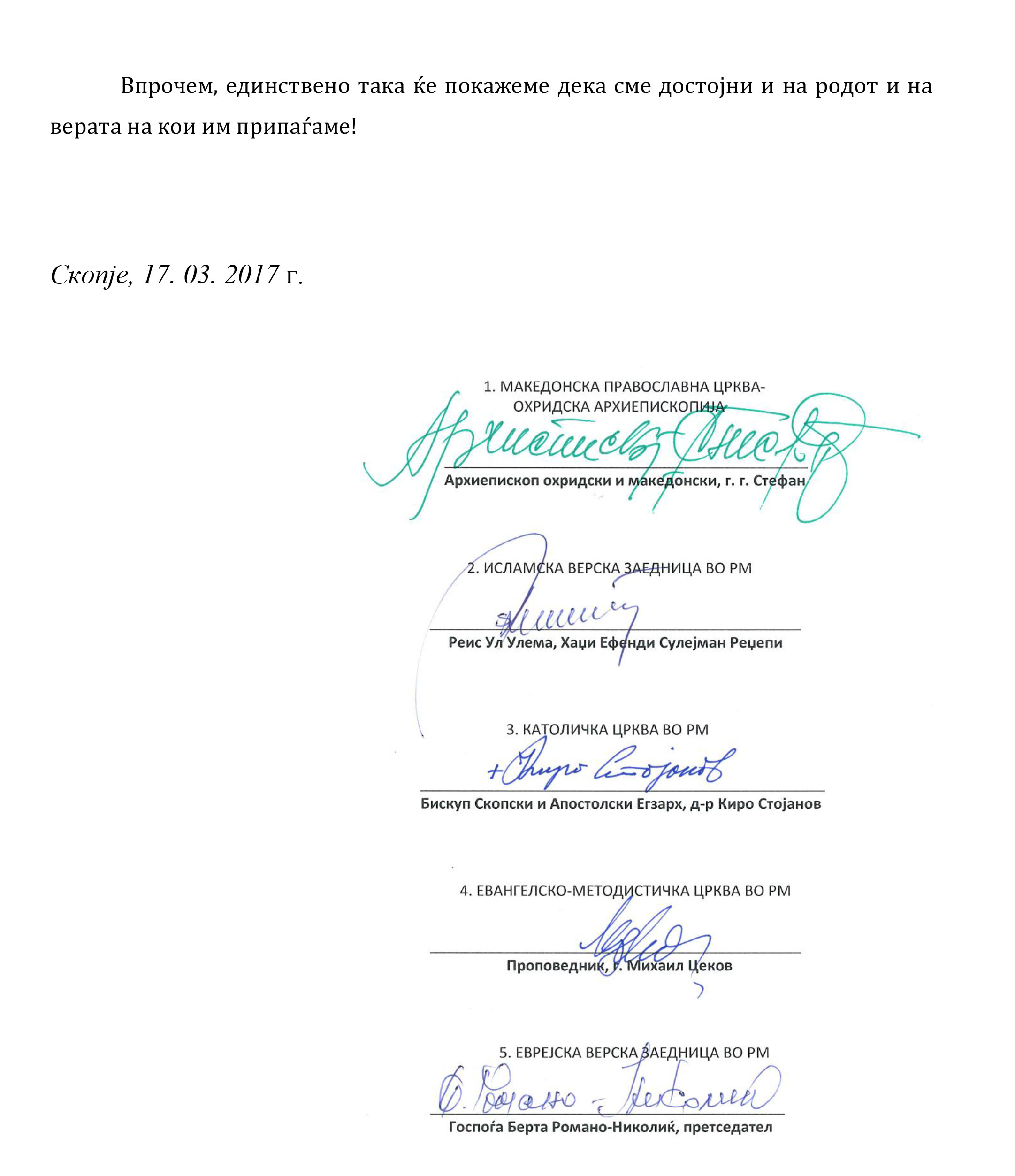 Црквите и верските заедници во Република Македонија, застапени во Уставот, со должно внимание ги следат настаните што веќе подолго време ги обременуваат секојдневието и живеењето на сите граѓани во Република Македонија.