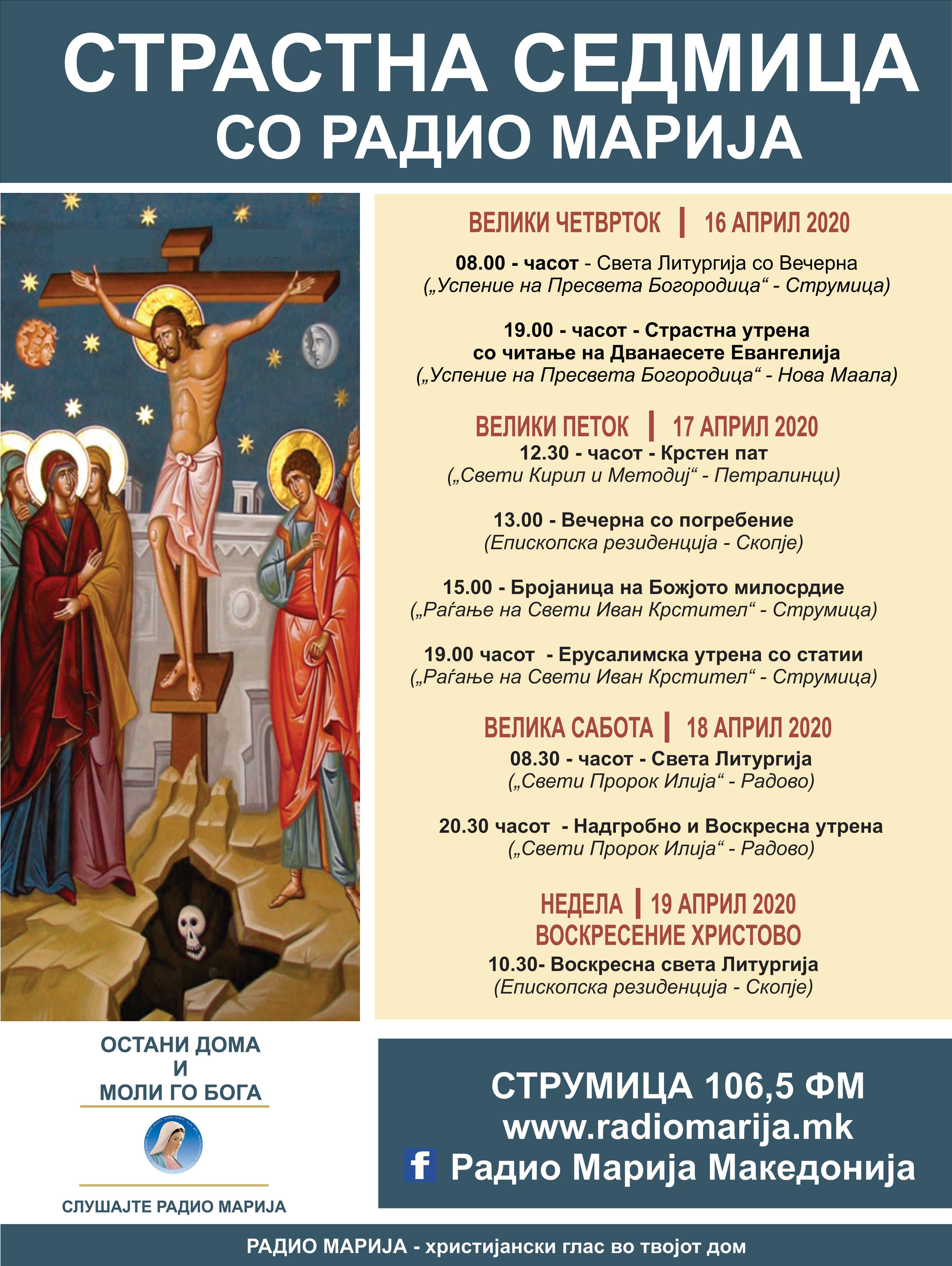 Католици.мк ги информира своите читатели дека на својата интернетска страница и facebook профилот ќе ги преземе и пренесува од Радио Марија богослужбите во Страстната седмица, кои ќе бидат преесувани од повеќе парохии.